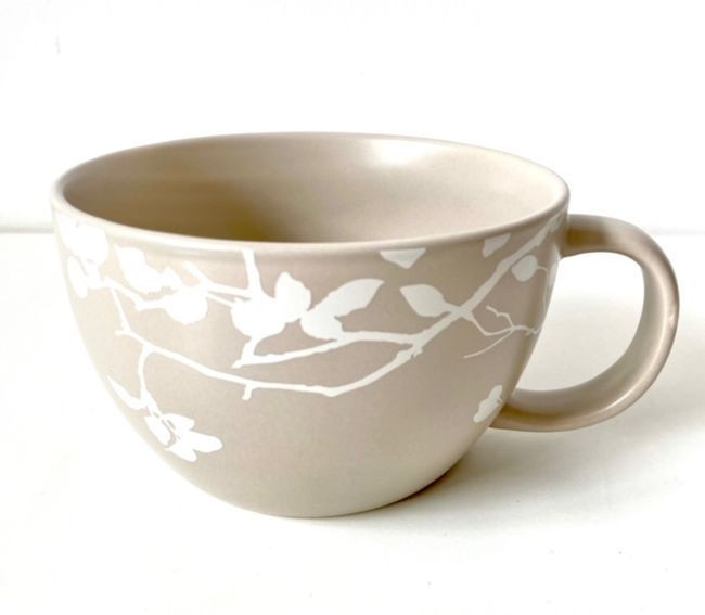 Kubek porcelanowy o pojemności 550 ml, zdobiony delikatną gałązką na jasnoszarym matowym tle. Wykonany z porcelany charakteryzującej się wyjątkową elegancją i wytrzymałością. Poręczne ucho gwarantuje stabilny uchwyt podczas picia.