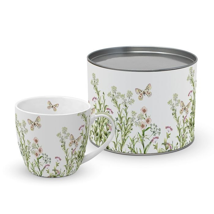 Kubek porcelanowych o pojemności 450 ml, przedstawiający ziołowy ogród w delikatnych kolorach z motylami. Wykonany z porcelany charakteryzującej się wyjątkową elegancją i wytrzymałością. Poręczne ucho gwarantuje stabilny uchwyt podczas picia. Zapakowany w ozdobną puszkę okrągłą, o tym samym motywie. To doskonały pomysł na upominek dla najbliższych, przyjaciół i znajomych.